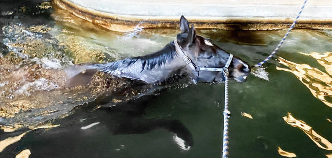 The equine pool is our best tool to allow horses to gain strength and allow for concussion-free healing during their rehabilitation process. The pool features hot and cold water- with warm baths during the cooler months. The pool building is heated during the winter. The pool features an "island" system with bridges that swing open for continuous laps. Two rubber ramps allow for easy access in and out.